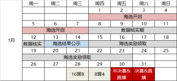 1月1日~1月7日:个人海选赛,单人匹配参赛,每日12:00~22:00开赛
