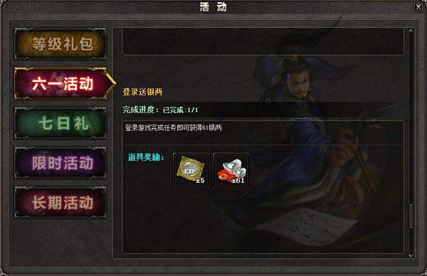 5月29日—6月3日期间,登录游戏完成任务即可获得61银两,任务仅可完成一次。