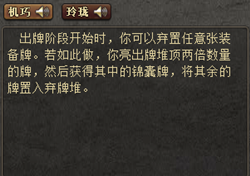 机巧这个技能名字取自于黄月英善于制造机械以及木牛流马的典故,相传诸葛亮设计的木牛流马就是源自于黄月英设计的木狗、木虎的原理,甚至也有传说木流牛马就是黄月英所设计。而作为技能,机巧主要的效果是可以让SP黄月英在出牌阶段开始时弃置任意数量的装备牌,然后展示牌堆顶两倍数量的牌并拿走这些牌中的锦囊牌。这个技能一次性弃置的装备牌数量越多收益越稳定,在使用时需要注意结合“玲珑”的效果来发动,仅仅为了过牌而使用这个技能过牌的收益是很低的,不要刻意为了发动技能而发动“机巧”。