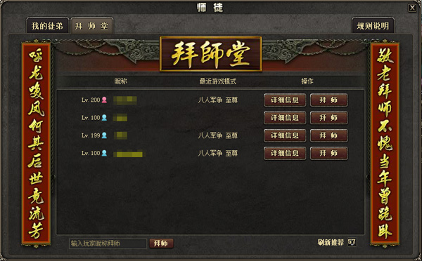 任何没有出师过的玩家均可拜师。拜师堂每分钟将随机推荐10位高手玩家,如果有确定的拜师对象,可通过左下角输入准确角色昵称进行拜师。注意拜师和收徒必须双方同时在线。