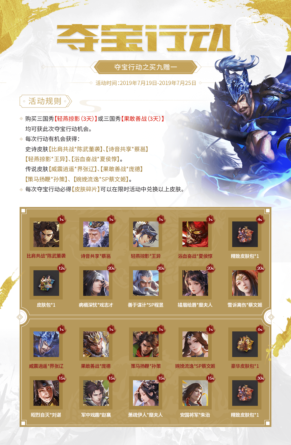 购买三国秀【盖世之才(3天)】,并赠送【夺宝行动(传说皮肤宝箱)】*1与【夺宝碎片】*4,打开宝箱可获得以下随机道具之一
