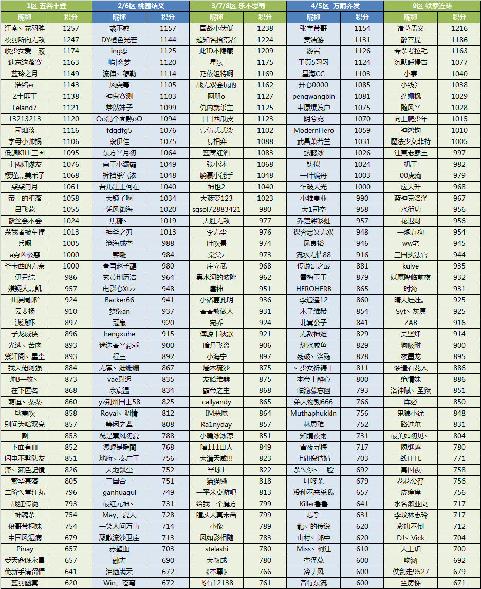 | 江南丶花羽眸 | 1257 | 彧不惑 | 1157 | 国战小伏低 | 1238 | 张宇带哥 | 1154 | 诸葛孟义 | 1216 |