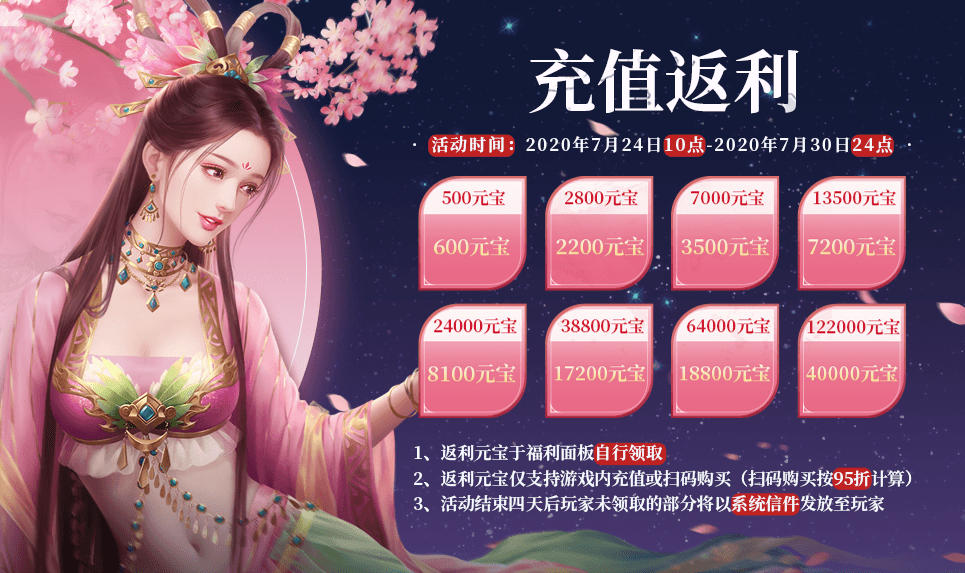2.充值返利仅支持游戏内进行充值和扫码购买(扫码购买折扣率为95折),不支持游戏外部充值参与本次活动