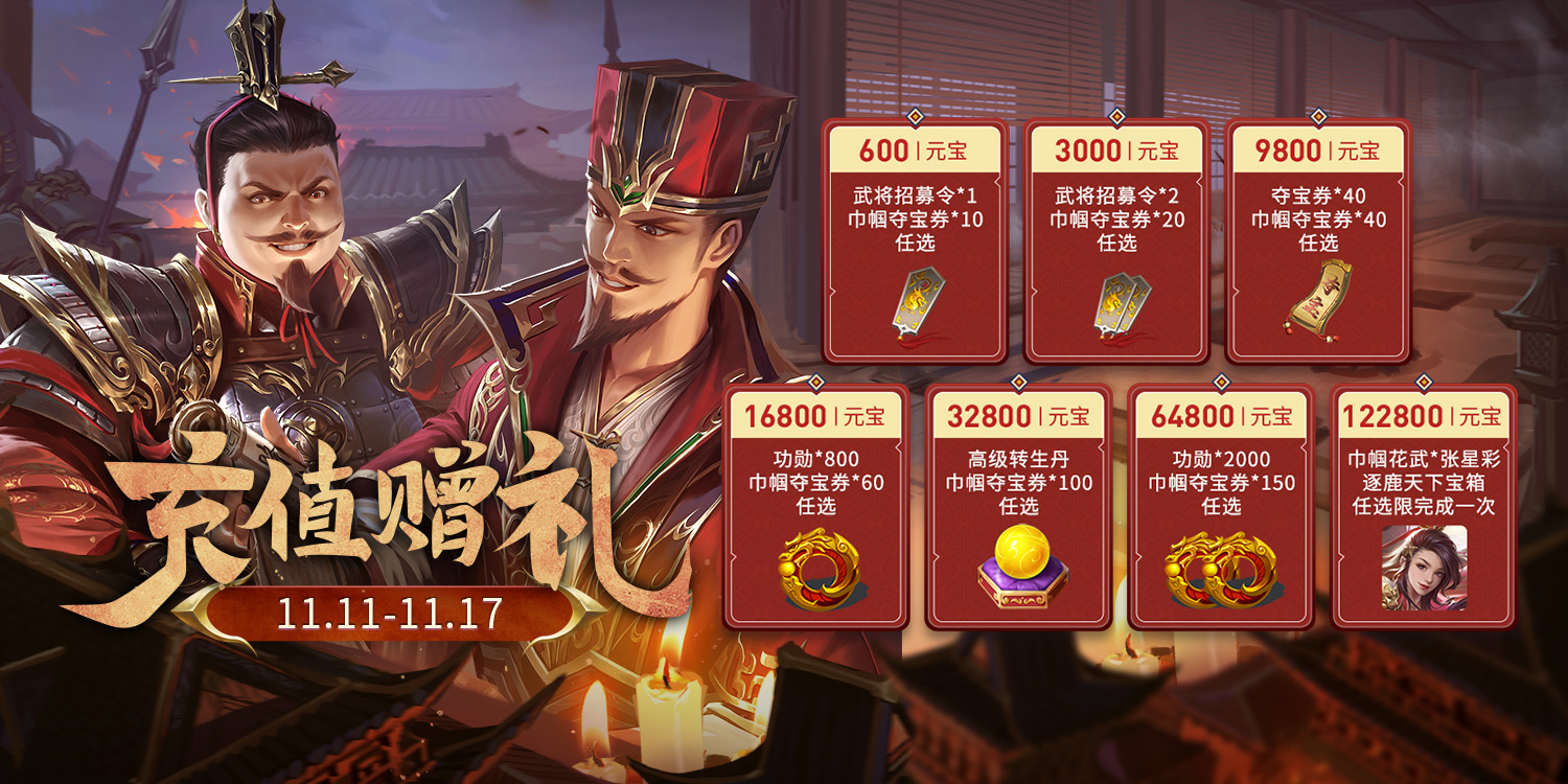 单笔充值6000元宝,可领取奖励:武将招募令*6、巾帼夺宝券*60、夺宝券*60,3选1,每日限完成1次。